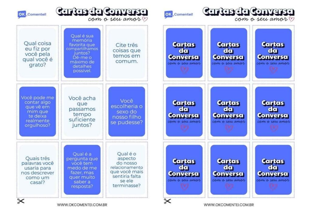 - Como jogar: basta embaralhar, retirar uma carta e os dois respondem para iniciar uma conversa profunda.